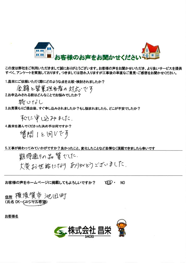 HOME > お客様の声・口コミ > お客様の声・口コミ 横須賀市池田町 U様【お客様の声】 2025-10-14 昌栄にご依頼いただく際にどのような点を比較・検討されましたか? 金額と営業担当者の対応です お申込みされる前はどんなことでお悩みでしたか? 特になし お見積もりご提出後、すぐ申し込みされましたか?もし悩まれましたら、どこが不安でしたか? すぐに申し込みました 昌栄を選んでくださった決め手は何ですか? 質問1と同じです 工事が終わってみていかがですか?良かったこと、変化したことなど忌憚なく頂戴できましたら幸いです 期待通りの品質でした。 大変お世話になりありがとうございました。 施工事例はコチラ -お客様の声・口コミ -お客様の声, 口コミ, 評判