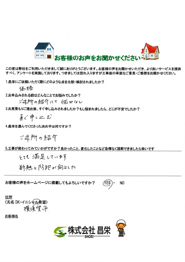 HOME > お客様の声・口コミ > お客様の声・口コミ 横須賀市岩戸 A様【お客様の声】 2025-12-08 昌栄にご依頼いただく際にどのような点を比較・検討されましたか? 価格 お申込みされる前はどんなことでお悩みでしたか? ご近所の紹介にて悩みなし お見積もりご提出後、すぐ申し込みされましたか?もし悩まれましたら、どこが不安でしたか? 直ぐ申し込む 昌栄を選んでくださった決め手は何ですか? ご近所の紹介 工事が終わってみていかがですか?良かったこと、変化したことなど忌憚なく頂戴できましたら幸いです とても満足しています 断熱と防犯が向上した -お客様の声・口コミ -お客様の声, 口コミ, 評判
