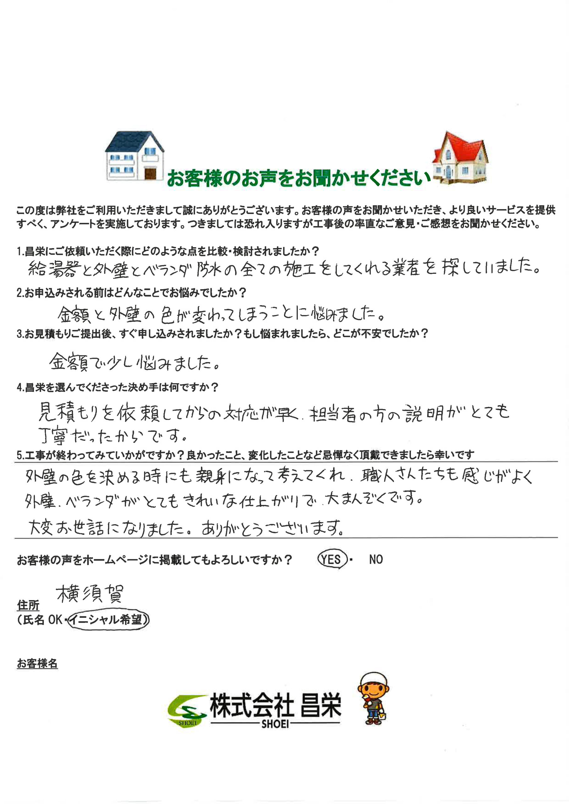 外壁の色を決める時にも親身になって考えてくれ、職人さんたちも感じがよく外壁、ベランダがとてもきれいな仕上りで大まんぞくです。