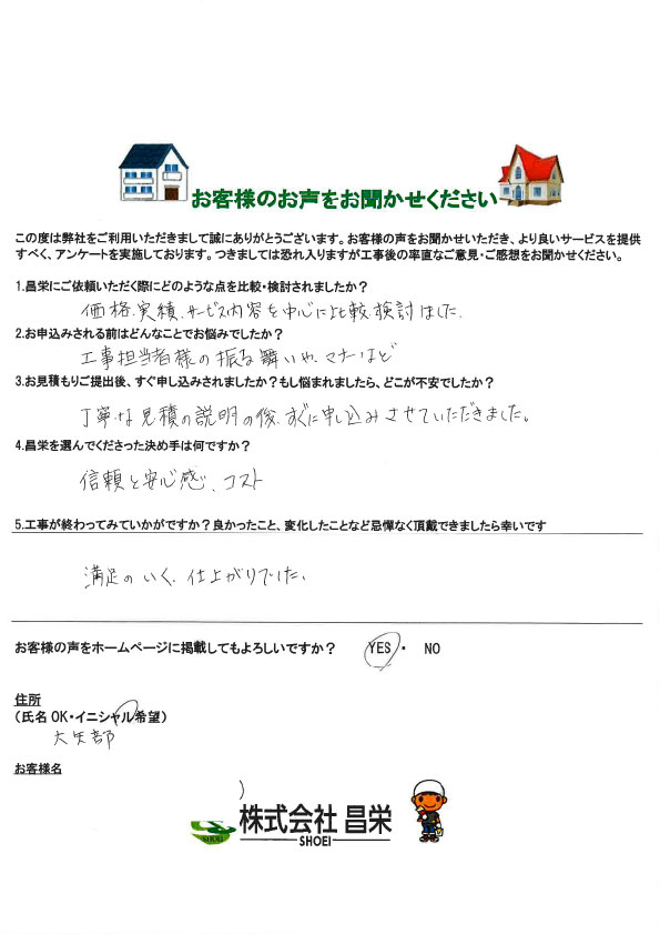 HOME > お客様の声・口コミ > お客様の声・口コミ 横須賀市大矢部 KN様|お客様の声 2026-03-18 昌栄にご依頼いただく際にどのような点を比較・検討されましたか? 価格、実績、サービス内容を中心に比較、検討しました。 お申込みされる前はどんなことでお悩みでしたか? 工事担当者様の振る舞いや、マナーなど お見積もりご提出後、すぐ申し込みされましたか?もし悩まれましたら、どこが不安でしたか? 丁寧な見積の説明の後、すぐに申し込みさせていただきました。 昌栄を選んでくださった決め手は何ですか? 信頼と安心感、コスト 工事が終わってみていかがですか?良かったこと、変化したことなど忌憚なく頂戴できましたら幸いです 満足のいく、仕上りでした。 \↓↓↓外壁や屋根の状態が気になる方は無料診断をご利用ください↓↓↓/ \LINEで無料で相談・点検・お見積り依頼!/ -お客様の声・口コミ -お客様の声, 口コミ, 評判